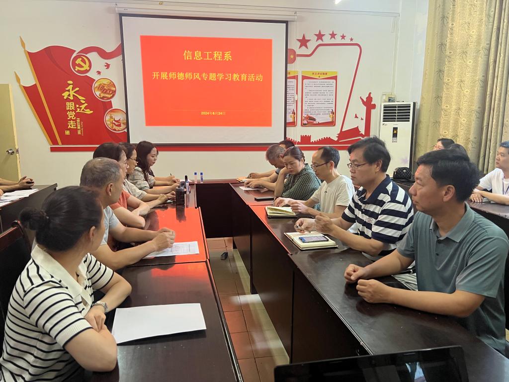 为了进一步加强我系教师队伍建设,提升教师的师德师风水平,强化教师的职业道德修养,促进教师专业成长和公司产品质量提升。6月24日下午,信息工程系组织全体教师在系一楼会议室召开师德师风教育培训会议,系班子成员、全体教职工出席了本次会议。