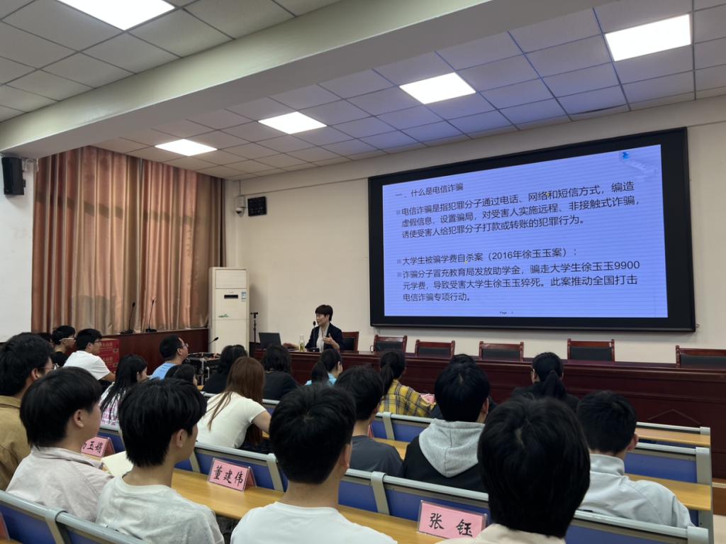 郭晓果结合实际案例,深入剖析了诈骗分子冒充公检法、客服、熟人诈骗以及贷款诈骗、兼职刷单诈骗等电信诈骗的常见手段,并对电信诈骗手段隐蔽、传播速度快、目标广泛、诈骗金额大等特点进行了分析。通过详细讲解各类诈骗场景,让同学们深刻认识到了电信诈骗的迷惑性和危害性。同时,郭晓果还分享了实用的防范技巧。一是做到“三问”,即问自己、问老师、问警方;二是做到“三不”,即不轻信、不转账、不泄露验证码。另外,严禁出售银行卡和电话卡,遇到可疑情况及时与老师、家长沟通或向警方求助。
